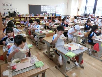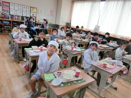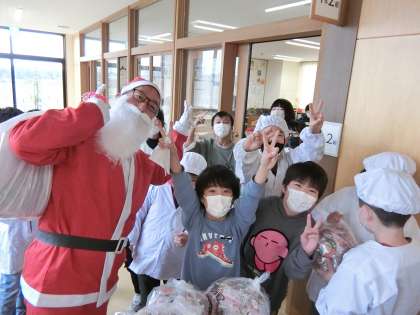 少し早いですが、本校にも「サンタクロース」と「トナカイ」がやってきて、給食時間に全学級にケーキをプレゼントしてくれました。子供たちは大喜びで、特に1年生は大興奮で、サンタクロースはもみくちゃにされて前に歩けませんでした。後期課程の生徒も照れくさそうでしたが喜んでいました。