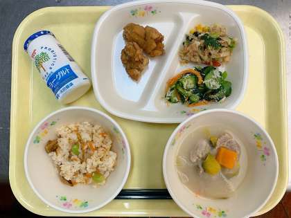 秋の香ご飯 発酵乳 鶏肉のレモン煮 しらすあえ ガーリックドレッシングサラダ まろやか豚汁 ➡ひたちなか市の特産品「さつまいも」や「しらすぼし」などを取り入れたMENUにしました。