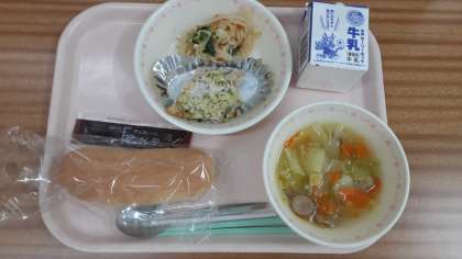 コッペパン チョコクリーム 牛乳 白身魚のマヨネーズ焼き 切り干し大根のサラダ パスタスープ