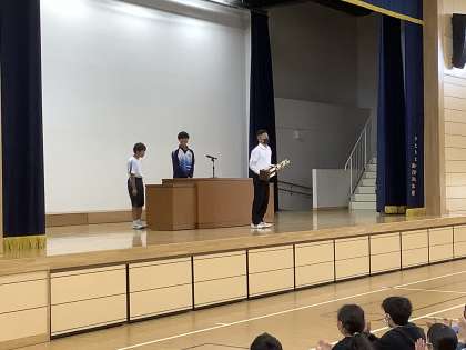 20日(土)に行われたスポーツ祭。結果発表を残して終了したので、本日昼休みに全校児童生徒で結果発表と表彰を行いました。発表前の緊張の一瞬。代表生徒の「優勝、赤組」の声に大歓声が上がりました。白組の児童生徒は大きな拍手でたたえていました。実行委員長が優勝トロフィーを渡す姿、それをもらう赤組団長の姿、笑顔で認め合う白組団長の姿はとても立派でした。