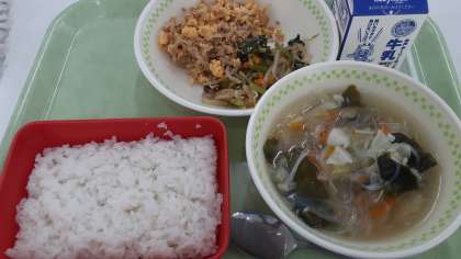 韓国料理の定番「ビビンバ」でした。給食ではカサ増しと栄養価アップのために「切り干し大根」を入れています。ゆでて細かく刻んで肉に混ぜます。切干大根の食感が意外に合うのです。