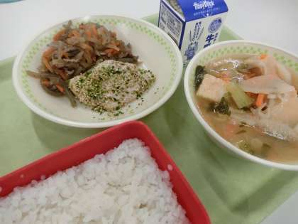 ごはん 牛乳 さばの香り焼き ヤーコンのきんぴら 生揚げと小松菜の味噌汁