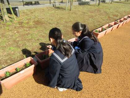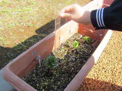 8年生が今週から総合的な学習の時間の1つとして、学校で栽培しているスカシユリの計測を始めました。
