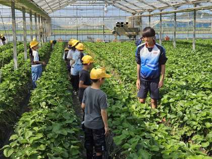 今日は給食でお世話になっている、バインベリー生産者の小池様と、JA常陸の学校給食担当の川又様にご協力いただき、いちご狩り体験をさせていただきました。第4学年は総合的な学習の時間の一環で「ひたちなか市の特産物を知って味わう」こと、第9学年は技術・家庭科(技術分野)の農作物の栽培学習の一環で「自分と農家の育てたいちごを比較し、商品となるような生物の育成方法を理解する」ことをねらいに実施しました。子供たちは、夢中で楽しそうにいちご狩りをしていました。甘くて新鮮ないちごを味わうことができたことはもちろんですが、地域にブランドいちごがあることや、いちごをパックへきれいに規定量を詰めることの難しさも実感していました。地域の方々のご厚意で、恵まれた環境のなか、感謝の気持ちで貴重な体験することができました。お忙しいところ、子供たちのためにありがとうございました。