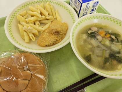 黒パン 牛乳 白身魚のレモンフライ ペンネソテー マセドアンスープ