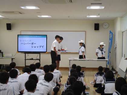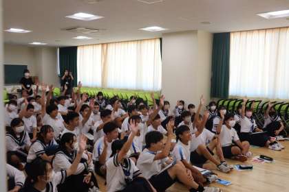 講演会では、9年代表生徒によるロールプレイを通して、契約と消費生活トラブルの問題点について考えました。また茨城県出身の漫才師「オスペンギン」による消費者クイズを通して、具体的なトラブルと対処方法について楽しくやりとりとしながら学ぶことができました。