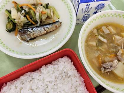 ごはん 牛乳 いわしの生姜煮 梅おかかあえ 豚汁
