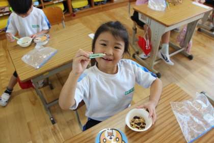 今日は1年1組で栄養教諭と実習生により「正しいおはしの持ち方」について食育授業を行いました。子供たちに実際におはしを使って、豆・スポンジ・マカロニをつまんでおわんに移す体験をしてもらいました。「難しい〜」「いつもはこの持ち方じゃないんだよな」と苦戦している子もいましたが、「できた!」と笑顔で教えてくれた子や、「もっとやりたい」と惜しがっている子もいました。授業後の給食時間には、意識しておはしを使っている子供の姿が見られました。「おはし名人」になるためには、1日ではなく日々の訓練が大切です。ご家庭でも正しい持ち方を振り返り、「巻く」「ほぐす」「すくう」などおはしを使って色々な使い方を試してみてください。1年2組は来週に実施予定です。
