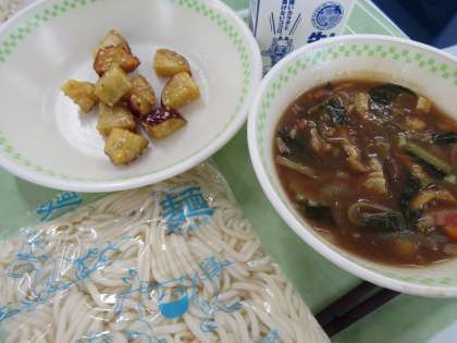 カレー南蛮うどん(ソフトメン) 牛乳 大学芋