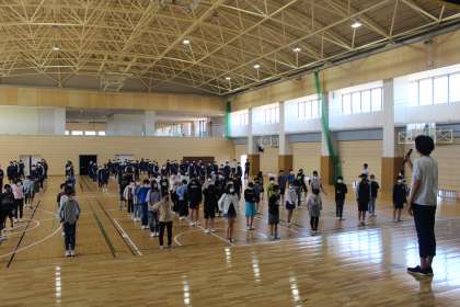 今週の金曜日に開校記念式典を実施します。式典には,児童生徒の代表として6年生・9年生が参加することになります。式典の最後には,校歌の作成者であるマシコタツロウさんの指揮のもと,校歌斉唱を予定しています。昼休みには,6年生・9年生合同で校歌の練習をしました。他の学年の児童生徒は各学級からモニターでの参加となりますので,6年生・9年生よろしくお願いします。