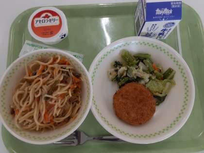 野菜たっぷりペペロンチーノ 牛乳 メンチカツ 小松菜サラダ アセロラゼリー