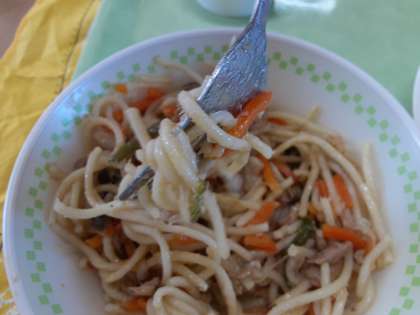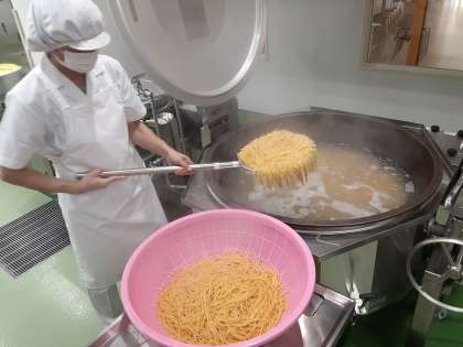 今日は美乃浜学園の給食で初めてスパゲッティが登場しました。みんな興味津々でした。もちろん,給食室で手作りです。調理員さんは何十キロもあるパスタを茹でて,2人がかりで力いっぱい混ぜていました。
