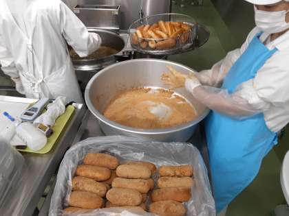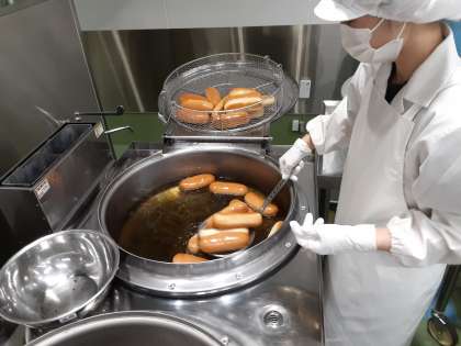 美乃浜で初の揚げパンでした。子供たちや先生方はずっと楽しみにしていたようです。調理員さんもうまくできるか,とても緊張していました。揚げパンはコッペパンを油で揚げて,1つ1つ優しくにぎって味をつけてクラス毎に数える作業があり,一手間かかるので頻繁には出せません。