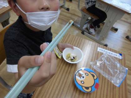 先週の金曜日,1年生で栄養教諭と担任の食育授業「おはしめいじんになれるかな」を行いました。おはしの正しい持ち方を学習し,実際に豆やスポンジ,マカロニをつまむ体験を行いました。おはしの持ち方はくせがついてしまうと,なかなか直しにくいです。正しい持ち方はすぐには身に付きませんが,毎日練習して少しずつできるようにがんばってみてください。ぜひ,ご家庭でもご支援をお願いします。