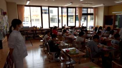 そして今日は大子町から,栄養教諭のT先生が給食の「衛生管理」と「栄養管理」を研修しに来校されました。本校の給食室は,衛生的なドライ方式の新しい施設です。遠くから勉強にきていただき,ありがとうございました。子供たちもスペシャルゲストに大歓迎でした。