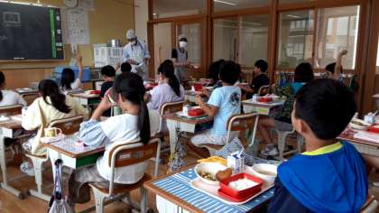梅雨の候ですが,「梅雨」という名前の由来は梅がたくさん収穫できることに,雨が長く降ることからついたと言われています。今日の給食時間には,梅雨にちなんで,4年1組で,梅雨の由来や梅のお話をしました。じめじめした蒸し暑いときには,体力や抵抗力が低下します。すっぱい梅の「クエン酸」パワーで疲れをとりましょう。