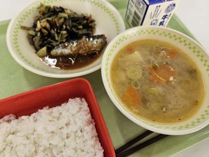 ごはん 牛乳 いわしの生姜煮 ひじきの煮物 スタミナ豚汁