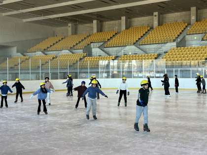 今日は笠松アイススケートリンクで6年スケート教室を行いました。6年生は4年生から始めて3回目の教室となります。最初は「できるかな」と少し心配気味な様子でしたが、学んだことは体が覚えているものです。スケート靴を履いてひとたびリンクにのると、目を輝かせて真剣な表情に。転び方に歩き方、ひょうたん、片足重心のかけ方から曲がり方まで、次々と課題に取り組んでいきました。インストラクターの指示に従ってみるみる上達していく子供たち。フリータイムではみんな笑顔で気持ちよく滑走できました。学校ではできない、冬ならではの貴重な体験ができて大満足でした。