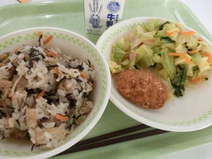 今日は五目ごはんとメンチカツが好評でした。五目ごはんには体に不足しがちな栄養素が含まれている「ひじき」「切り干し大根」「にんじん」「ごぼう」など子供たちが苦手とする食材が入っていますが、これなら食べられるという子もいます。ぜひ、ご家庭でもお試しください。