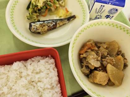今日は和食でしたが、さんまの味噌煮と煮物が好評でした。しょうゆと砂糖の甘しょっぱいホッとする味付けでした。しかし、費用はとてもかかっていて(魚も1個100円ほどします)、通常の給食費245円/食(後期課程は270円/食)ではとても提供できないので、不足分は市が負担してくださっています。