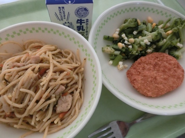 春キャベツのジェノベーゼスパゲッティ 牛乳 コロッケ ブロッコリーとチーズのサラダ