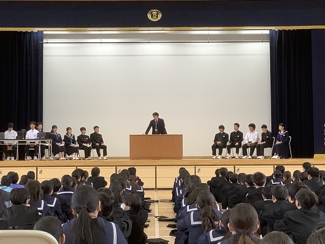 校長先生や児童生徒会本部役員の生徒から、「自分たちでこうしようと決めたきまりなので、自分たちで守れるように協力し、努力しましょう」という話があり、それに頷きながら話し手を見つめる児童生徒たちがとても頼もしい!