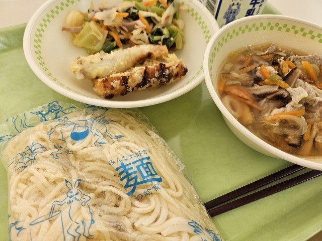給食の定番「ソフトめん」を提供しました。今年度は1回増えて年に3回の提供となります。数年前、市内の大手ソフトめん製麺会社が廃業になってしまい、現在は茨城県学校給食会のご協力のもと、笠間市の製麺会社「橋本屋」さんから購入しています。頻繁に提供できない理由は、トラックの輸送費(送料)で1回3万円ほどかかることや、他市町村との兼ね合いがあります。