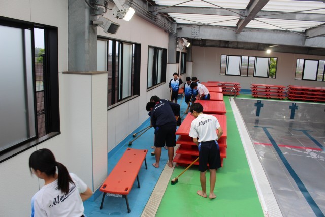 今年度もみんなが気持ちよくプールを使えるように、7・8年生のお兄さん、お姉さんや、男女ソフトテニス部・野球部の7年生が、プール清掃をしてくれました。