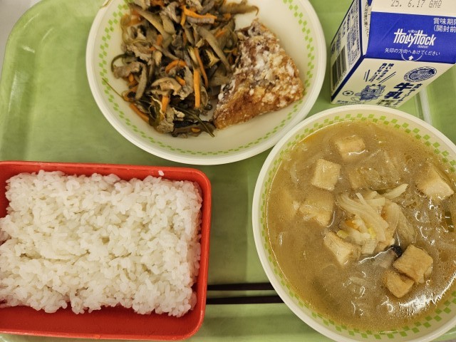 ごはん 牛乳 めばるの竜田揚げ 茎わかめ入りきんぴら 切り干し大根の味噌汁