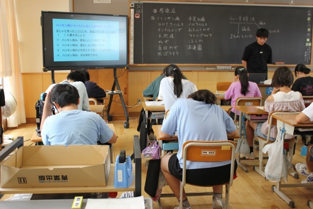 病気に対する誤解から、多くの人々が不当な扱いを受けてきた事実に触れ、子どもたちは真剣な表情で映像に見入っていました。