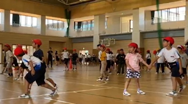 5年生は、グループでペアを作ってから元気いっぱいに「増やし鬼ごっこ」。