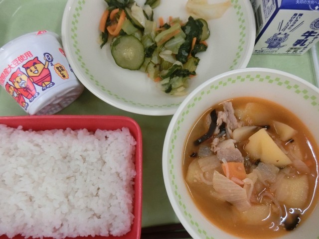 ごはん 牛乳 納豆 ピリ辛肉じゃが チンゲン菜の酢しょうゆあえ
