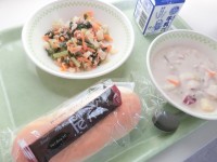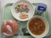 ★給食メニュー 黒パン 牛乳 鰙(わかさぎ)フリッター ツナ豆サラダ カレースー...