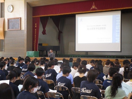 本日は、中学3年生を対象とした私立高校説明会が行われました。学校に私立高校が9校来校し、高等学校の特色や生徒の様子、進路状況等を聞くことができました。高校3年間を見据え、自分にあった高校、自分を成長させてくれる高校を選べるよう、学校としても支援していきます。ご相談や質問がありましたら、学校までご連絡ください。