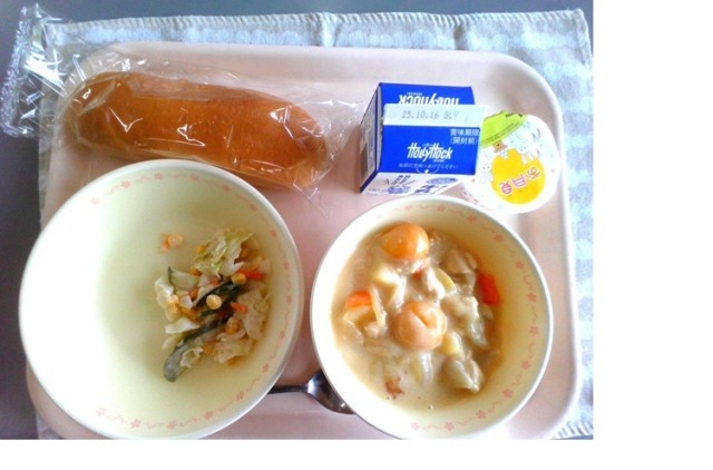 10月6日はお月見の日です。日本では月にお餅をついているうさぎの模様があるように見えるといいますが、見え方は国によって違うことを知っていますか?例えば、南アメリカではロバ、中国ではヒキガエルの頭と前足など、様々です。今日の献立には、お月見ゼリーとシチューに月をイメージした黄色いお餅が入っていました。みんなおいしそうに食べていました!(広報委員3年)