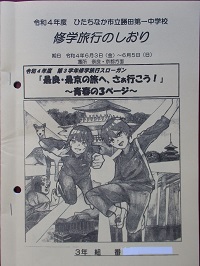 6/1(水) 今週末は1年校外学習、2年宿泊学習、3年修学旅行と旅行的行事を控えています。それに向けて各学年では、事前指導等、趣向をこらして着々と準備を進めています。写真は各学年のお子さん達が描いてくれたイラストを表紙にしたしおりです。