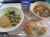今日の献立は、米パン、牛乳、ローズポークメンチカツ、ガーリックドレッシングサラダ、かみかみミネストローネでした。