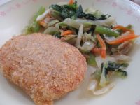 ローズポークのメンチカツは、外側はサクサクしていて、噛むとジュワーと肉の味がしみ出てきます。サラダは、ガーリック風味で元気が出そうです。