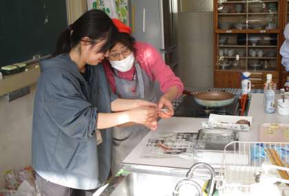 1月8日(水)から市食生活改善推進委員協議会の方々による「いわしの手開き及びいわしの蒲焼きの調理法」についての実習が行われています。1クラス2時間をかけて、1年生の生徒を対象に一人一人に付き添いながら丁寧に教えてくれました。初めて体験する生徒が多く、生徒たちの表情はみな真剣でした。