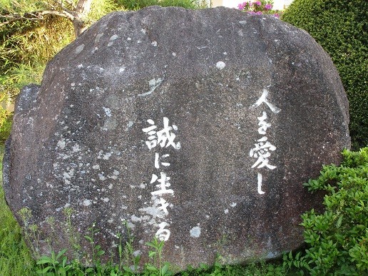 本日は天気がよく、大変過ごしやすい1日でした。連休後の疲れがある中、生徒たちはよく頑張っています。本日は、1年生の体験入部もありました。部活動中は、校庭から元気な声が聞こえています。職員玄関前には「人を愛し 誠に生きる」という石碑があります。今は、その前のバラの花がきれいに咲いています。昨年はあまり花を咲かせなかったバラですが、本年はきれいに花を咲かせています。