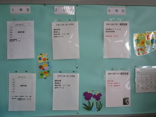勝田一中には別室が用意されています。別室では、自分が決めた学習やオンライン学習を行っています。本日や次の日の予定が分かるよう、室内には各学年の予定が掲示されています。生徒たちは、安心して過ごしています。各時間、学習を教えることはしませんが、先生がつき生徒の様子を見守っています。生徒たちもよく頑張っています。