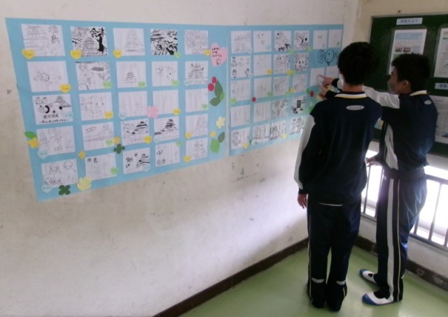 本日の2学年総合的な学習の時間では、宿泊学習に向けてキャリアパスポートで個人目標を設定したり、しおりの読み合わせをしたりしました。しおりを作成するにあたり、学年でイラストの募集をしました。芸術的なイラストや赤べこ、ソースかつ丼などのかわいらしいイラストなど、49名もの生徒が応募しました。49枚すべてのイラストを階段おどり場に飾り、宿泊学習に思いを馳せています。