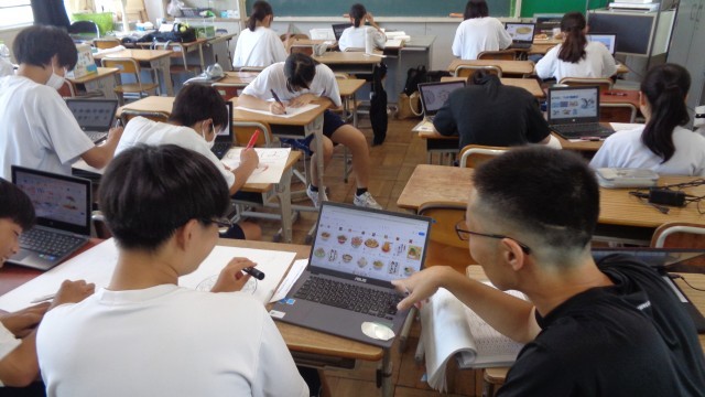 特定非営利活動法人E-nnovationの佐々木様とボランティアの高校生2人をゲストに迎え、8月に行われる職業体験の準備の一環として、2学年の生徒たちが「ご当地かるた」づくりに励みました。