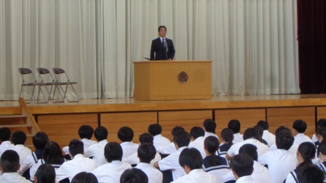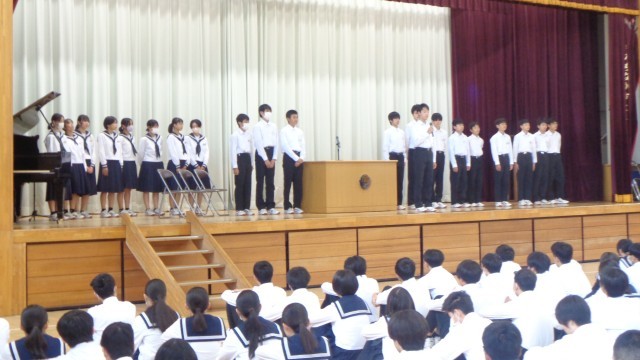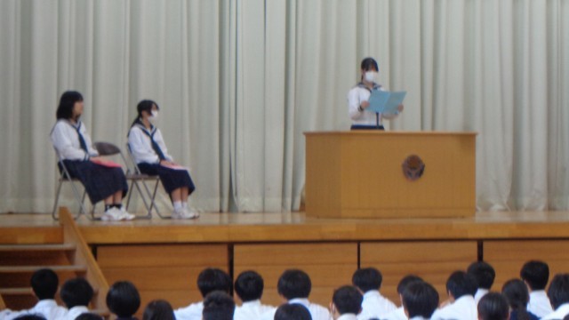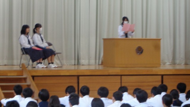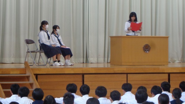 各学年の代表生徒が、前期の振り返りや後期の目標について作文発表をしました。