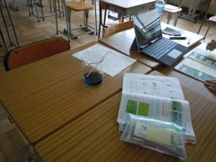 今日は理科の授業を紹介します。本来ならば個人やグループで行う実験を,担当の先生が実験をやってみて,それを画面越しに伝える,という授業を行っています。