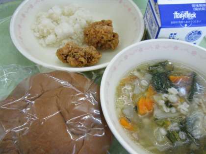 今日の給食は,ココアパン,鶏肉のから揚げ,粉ふき芋,麦入り野菜スープ,牛乳です。