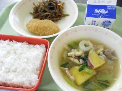 今日の献立は,ご飯,もうかフライ,きんぴら,さつま汁です。