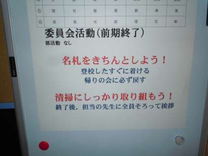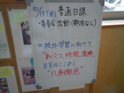 以前にも紹介しましたが,校内には学年掲示板が3ヶ所あります。そこには次の日の予定だけではなく,学年主任からのメッセージが書かれています。今日の1年生の掲示板には「凡事徹底」,2年生の掲示板には「清掃にしっかり取り組もう」という言葉がありました。後期がスタートした今だからこそ,生徒に伝えたいメッセージだと思います。