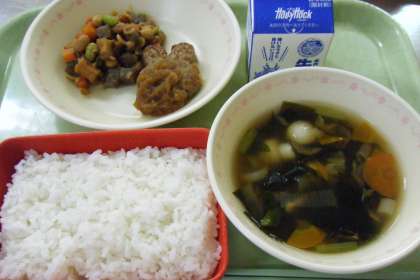今日の献立は,ご飯,ハンバーグ,五目豆,月見汁,牛乳です。