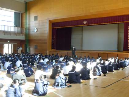 1年生が明日の校外学習に向けて学年集会を行いました。先月の3年生の修学旅行に続いての旅行的行事になります。この後,16,17日に2年生が宿泊学習を行う予定です。